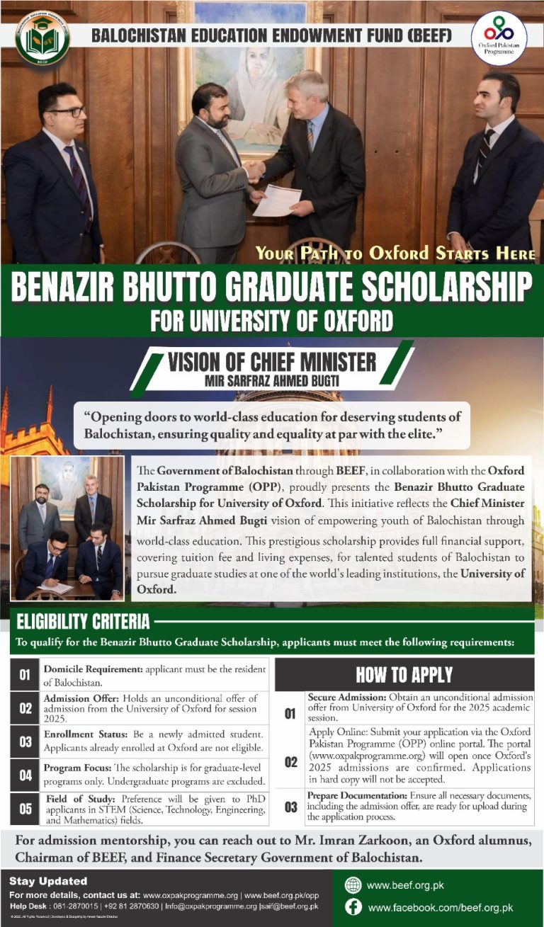 The Government of Balochistan through BEEF, in collaboration with the Oxford Pakistan Programme (OPP), proudly presents the Benazir Bhutto Graduate Scholarship for University of Oxford. This initiative reflects the Chief Minister’s vision of empowering Balochistan’s youth through world-class education.
