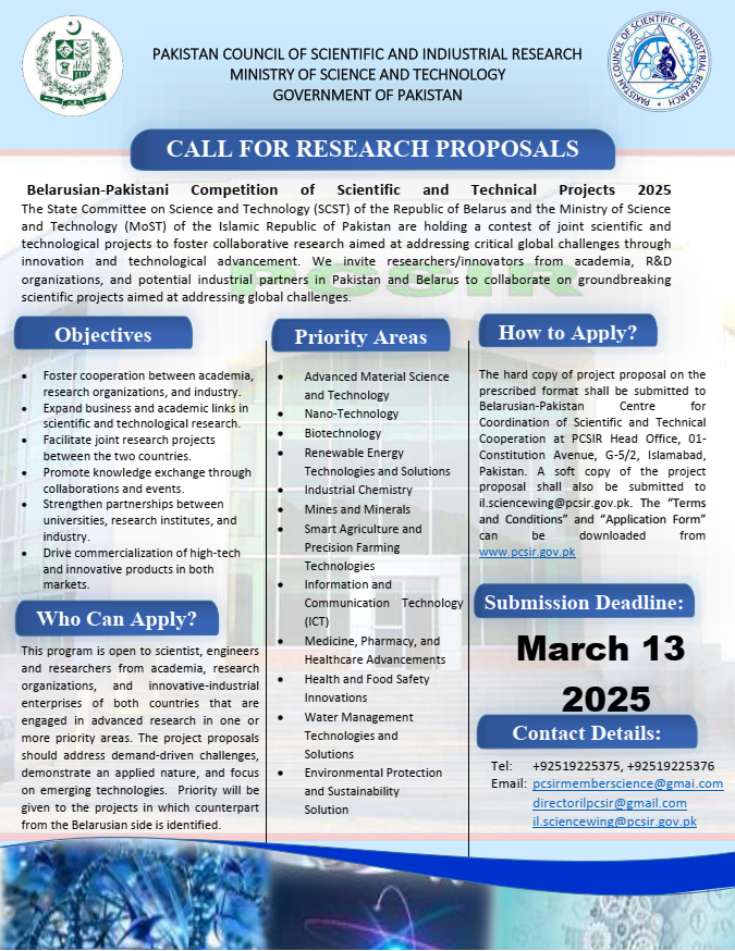 The State Committee on Science and Technology (SCST) of the Republic of Belarus and the Ministry of Science and Technology (MoST) of the Islamic Republic of Pakistan are holding a contest of joint scientific and technological projects to foster collaborative research aimed at addressing critical global challenges through innovation and technological advancement.