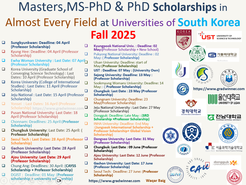 Dear all, Apply for South Korea Masters/MPhil, PhD, MS/MPhil leading to PhD Fall 2025 Scholarships in different Universities