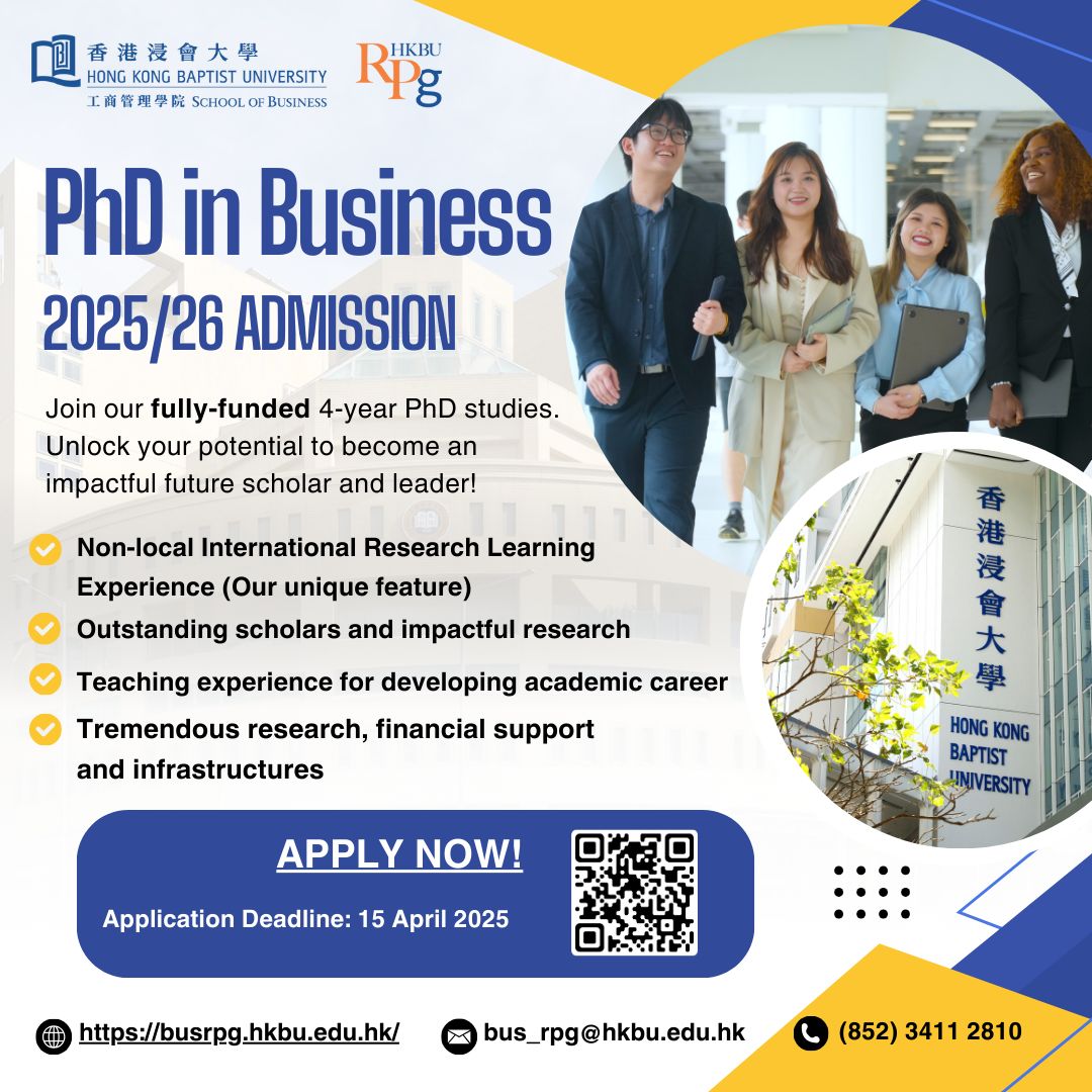 ๐ข Calling all aspiring researchers to apply for our ๐ณ๐๐น๐น๐-๐ณ๐๐ป๐ฑ๐ฒ๐ฑ 4-year PhD Program in Business Studies at Hong Kong Baptist University !