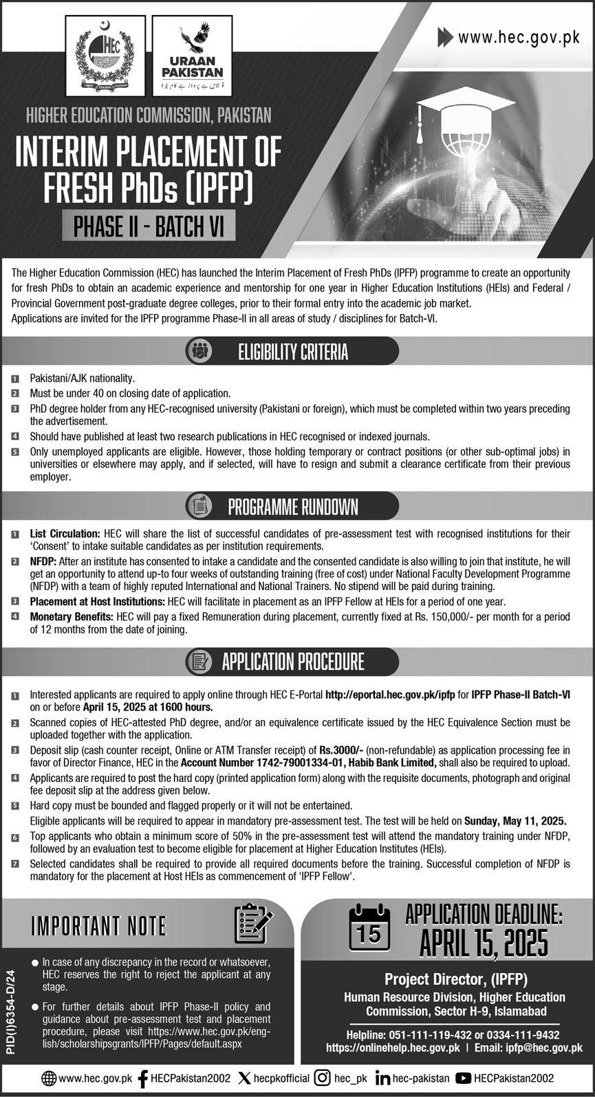 The Higher Education Commission (HEC) has launched the Interim Placement of Fresh PhDs (IPFP) program to create an opportunity for fresh PhDs to obtain academic experience and mentorship for one year in Higher Education Institutions (HEIs) and Federal/Provincial Government post-graduate degree colleges, prior to their formal entry into the academic job market.