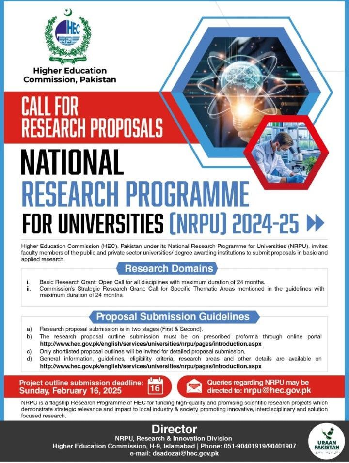 The National Research Program for Universities (NRPU), administered by Pakistan’s Higher Education Commission (HEC), is a flagship initiative designed to empower researchers, faculty, and universities to conduct high-impact, innovative research in critical fields. This competitive grant program aims to: