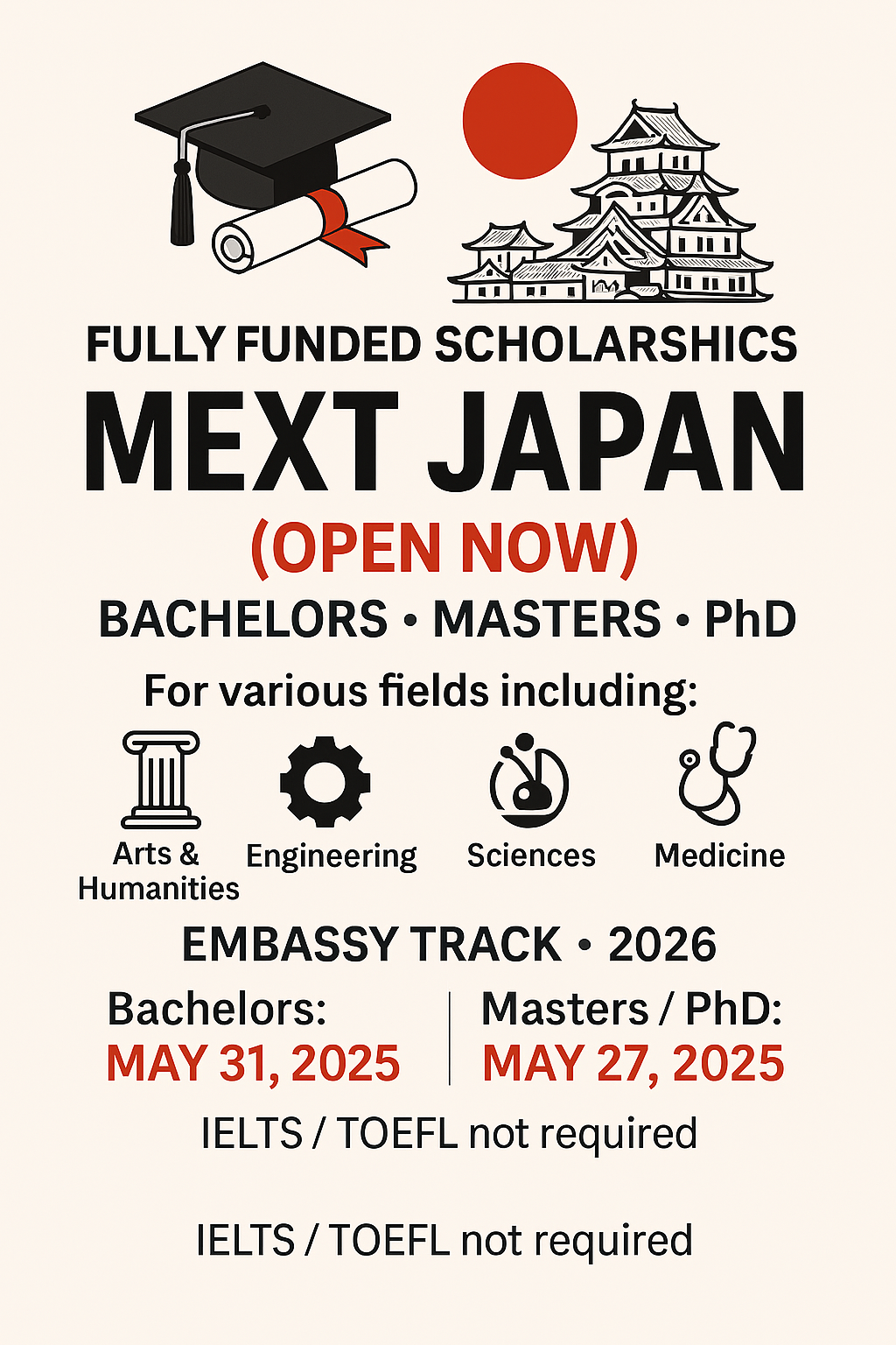 Fully Funded Scholarships MEXT Japan (Open Now) under EMBASSY Track 2026 for Bachelors, Masters, PhD