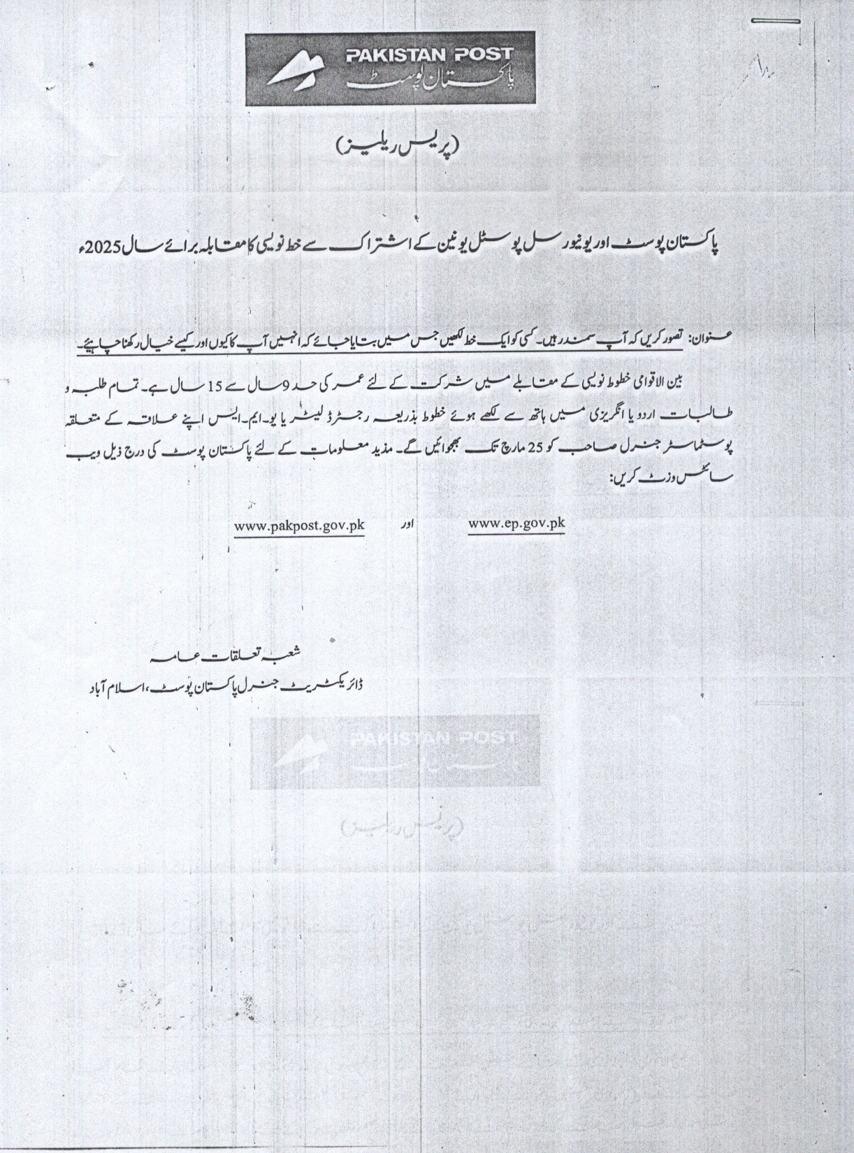 The Letter Writing Competition for 2025 is open until March 25. All students (male or female) from 09 to 15 years of age can participate by submitting hand-written letters in Urdu or English to your region's concerned post master general through registered mail or UMS
