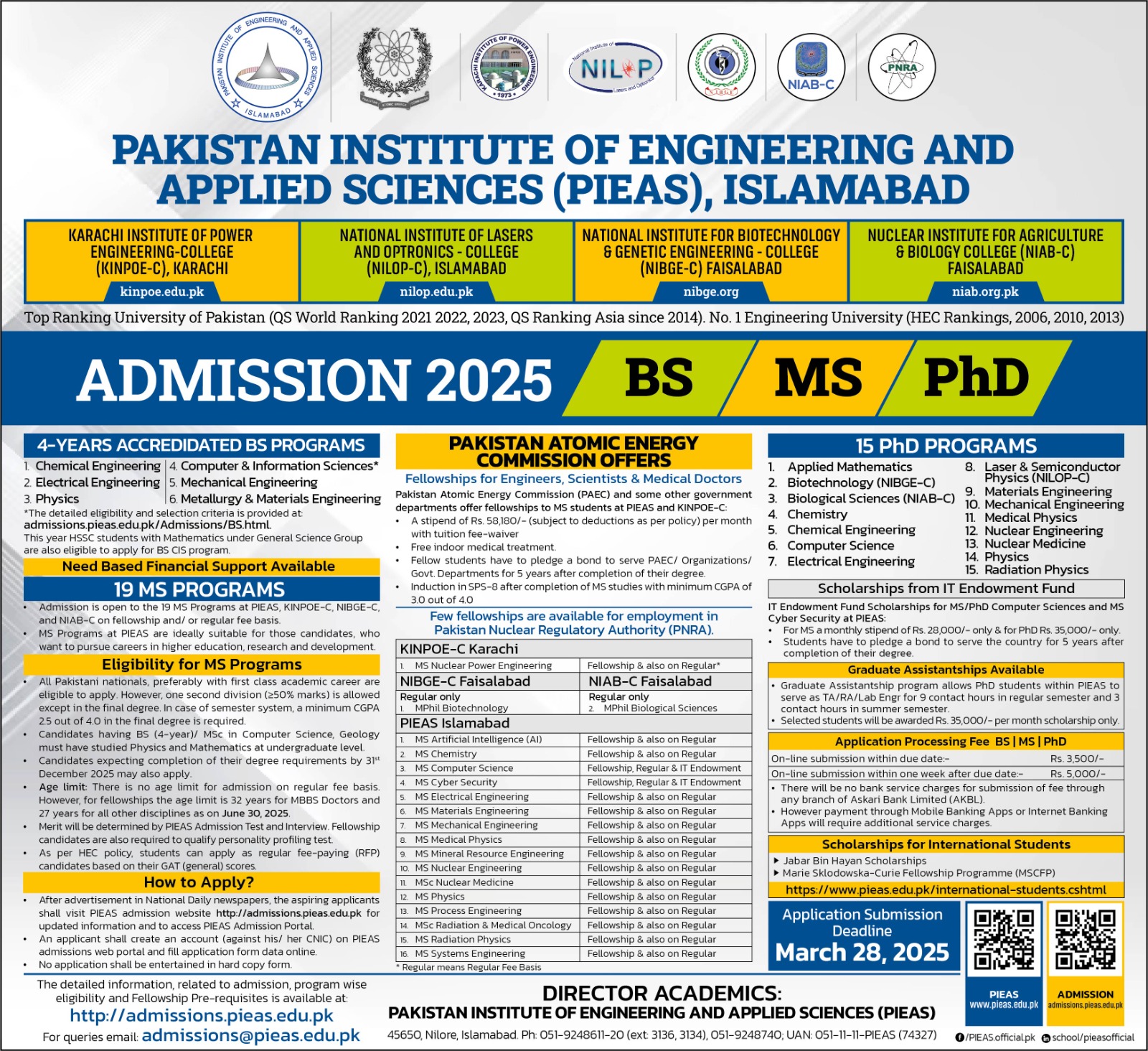 π Online Application Portal: https://admissions.pieas.edu.pk
