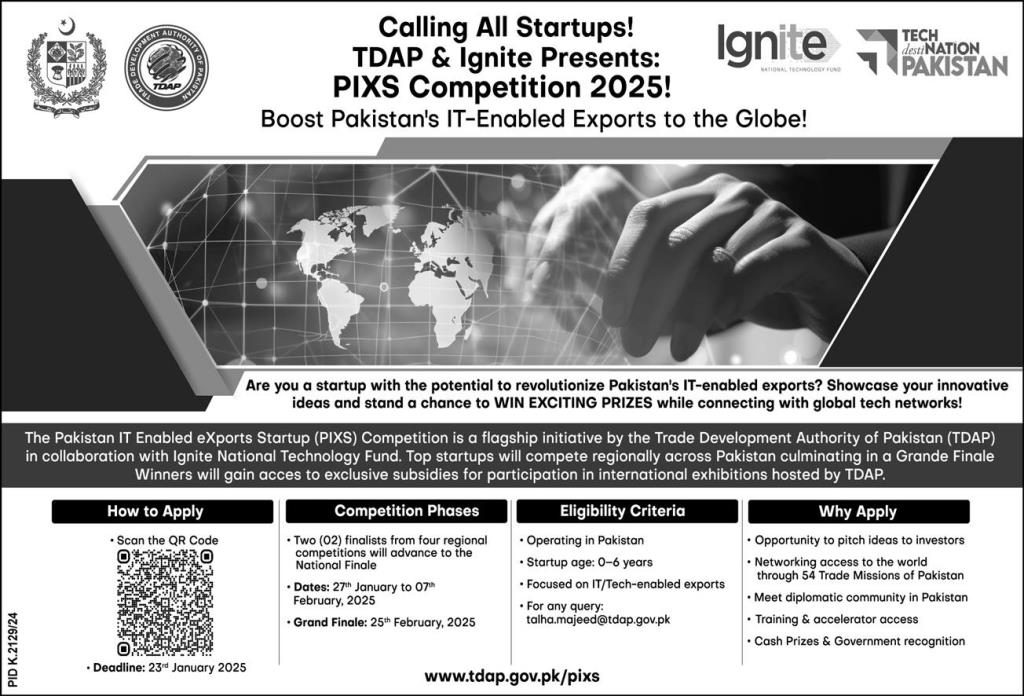 The Pakistan IT Enabled eXports Startup (PIXS) Competition is a flagship initiative by the Trade Development Authority of Pakistan (TDAP) in collaboration with the Ignite National Technology Fund. Top startups will compete regionally, with the finalists battling it out in Lahore.