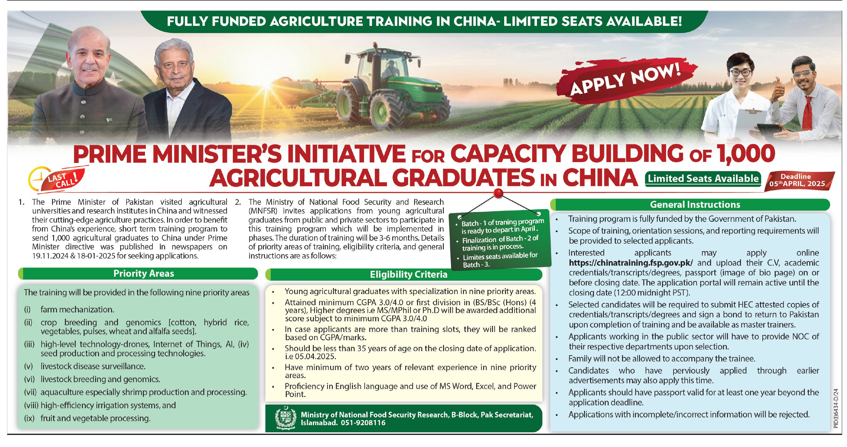 - The Ministry of National Food Security and Research (MNFSR) invites applications from young agricultural graduates from public and private sectors to participate in this training program, which will be implemented in phases. The duration of training will be 3-6 months. Details of priority areas of training, eligibility criteria, and general instructions are as follows: