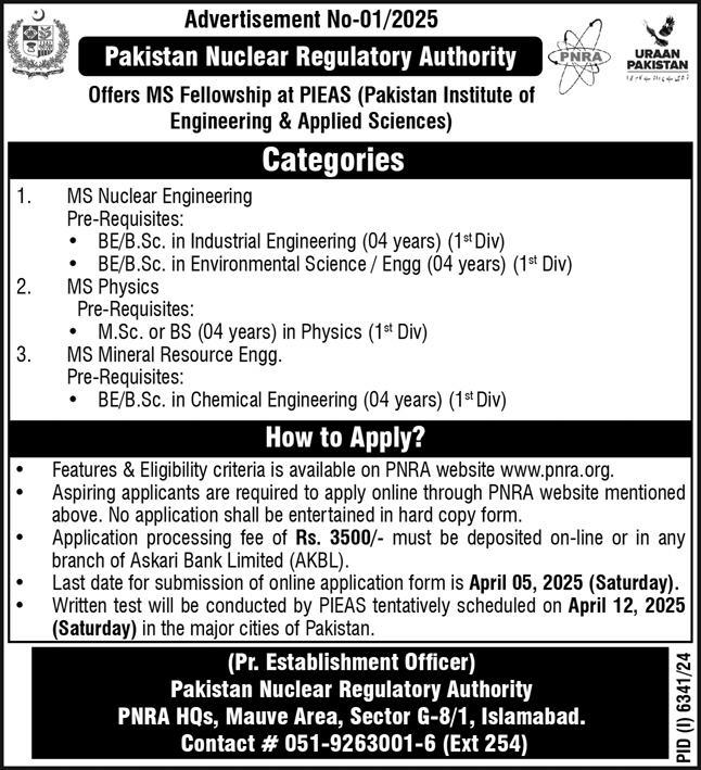 Do apply for PNRA (Pakistan Nuclear Regulatory Authority) Fellowships leading to permanent job after completion of MS program on PNRA fellowship from PIEAS