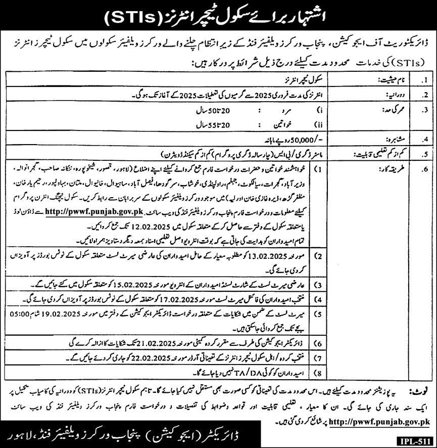 500 School Teaching Interns at Different Districts of Punjab in Punjab Workers Welfare Schools