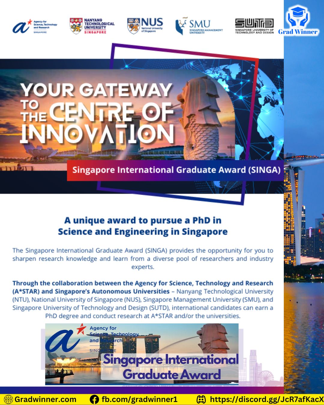 The Singapore International Graduate Award (SINGA) is a prestigious, fully funded scholarship for international students pursuing PhD or EngD degrees in science, engineering, and related disciplines at Singapore’s top universities and research institutes.